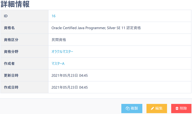 詳細アイコンをクリックすると、以下のように詳細情報が確認出来ます。「編集」「削除」「複製」が可能です。