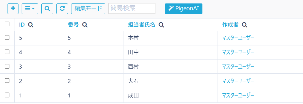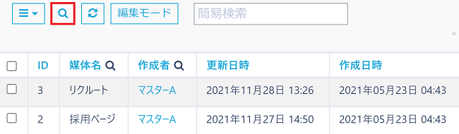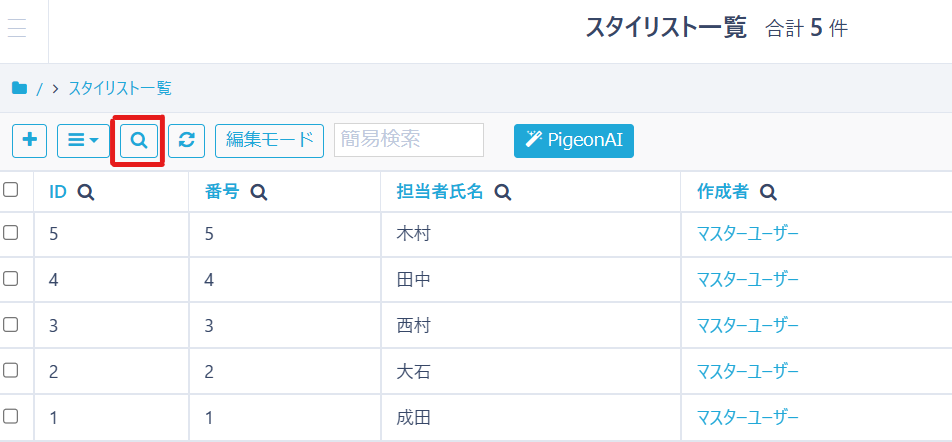 レコードの検索は一覧画面上部の「虫眼鏡」アイコンから行うことが出来ます。
