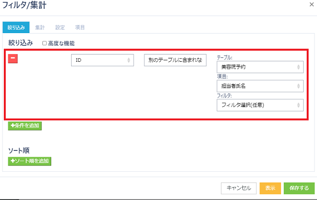 集計画面が表示されるので、「絞り込み」および「ソート順」の設定を行い「表示」ボタンをクリックします。