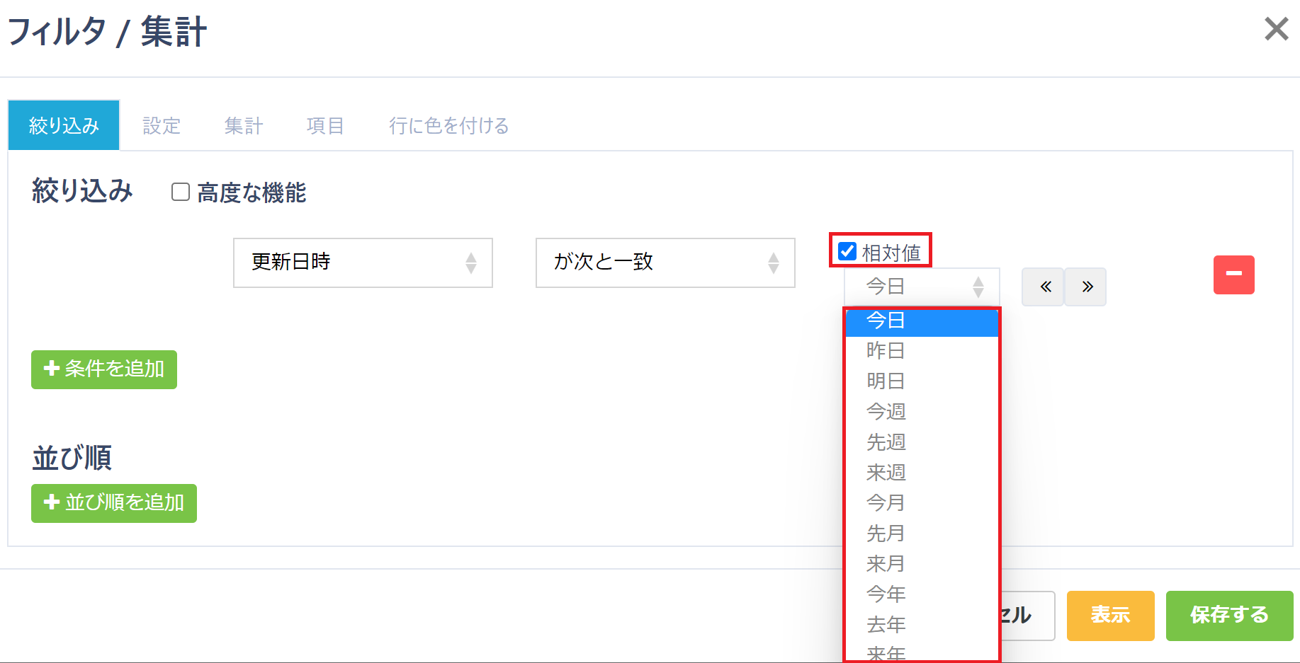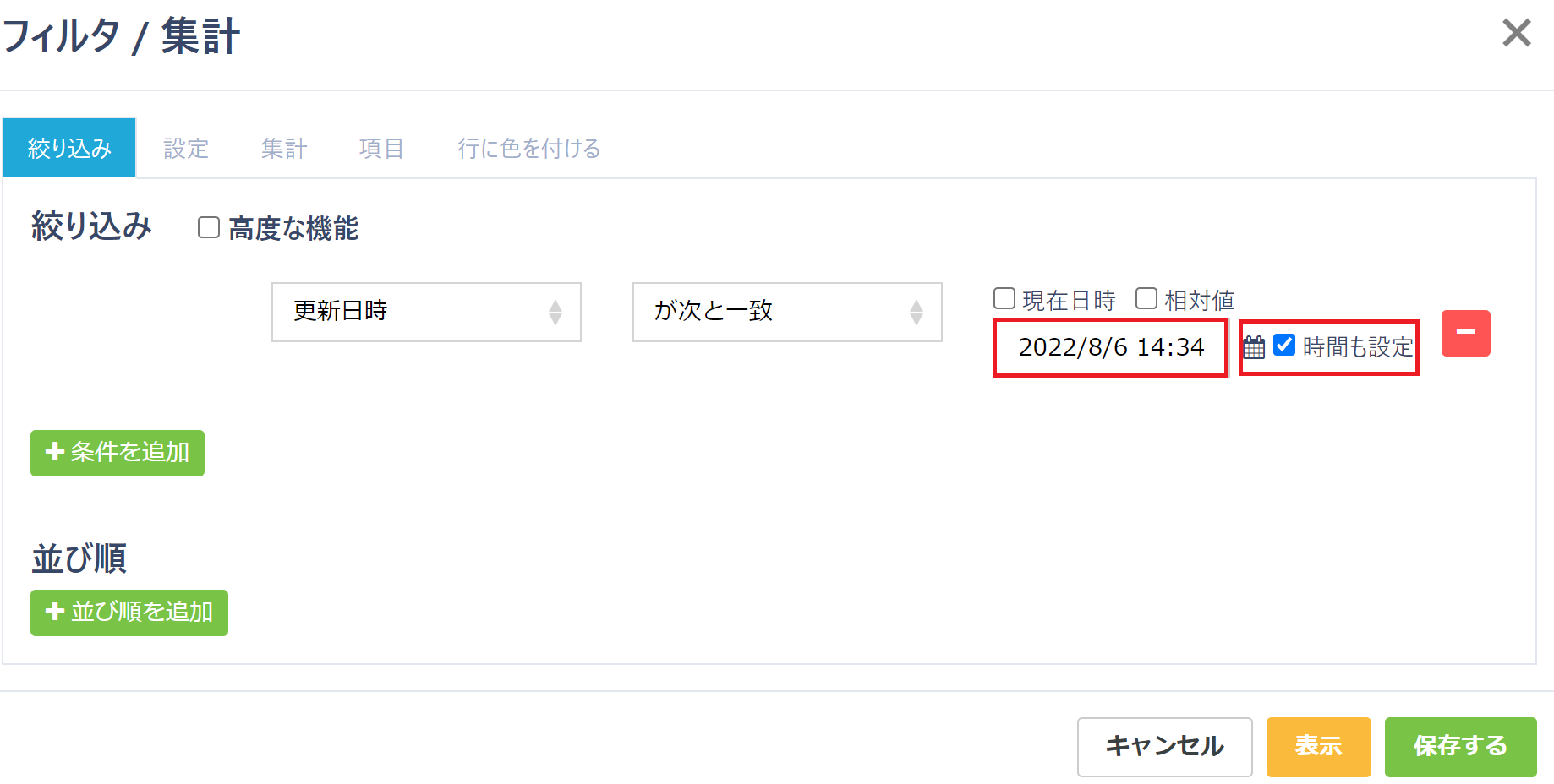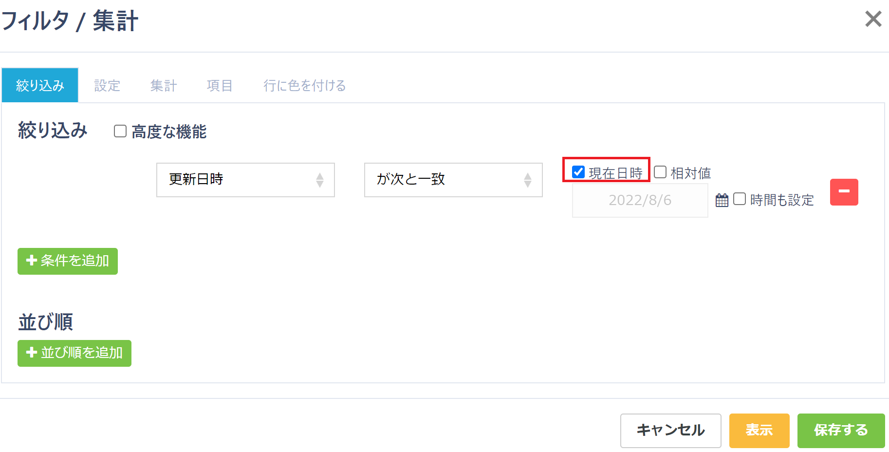 ※該当テーブルの項目種別が「日時」項目の場合、「現在日時」/「相対値」/「時間も指定」の設定が可能です。