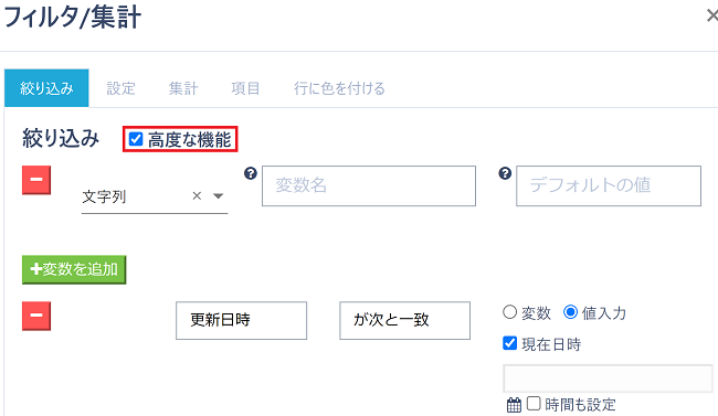 高機能な機能にチェックを入れることで、絞り込み時に変数を設定することが可能になります。