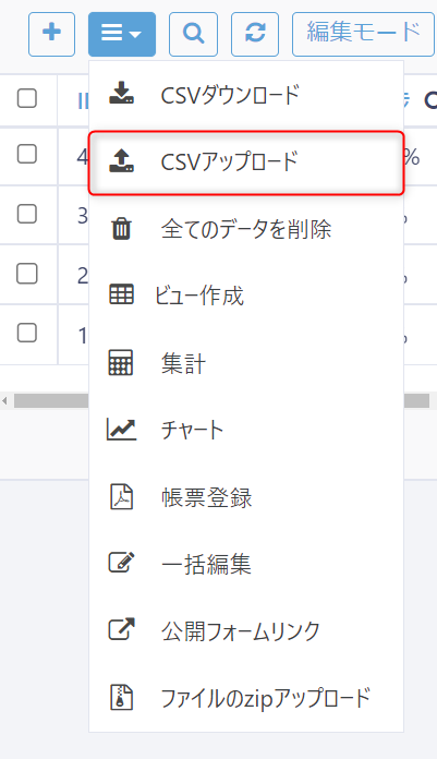 作成済みのテーブルを開き、左上メニューより「CSVアップロード」を選択します。