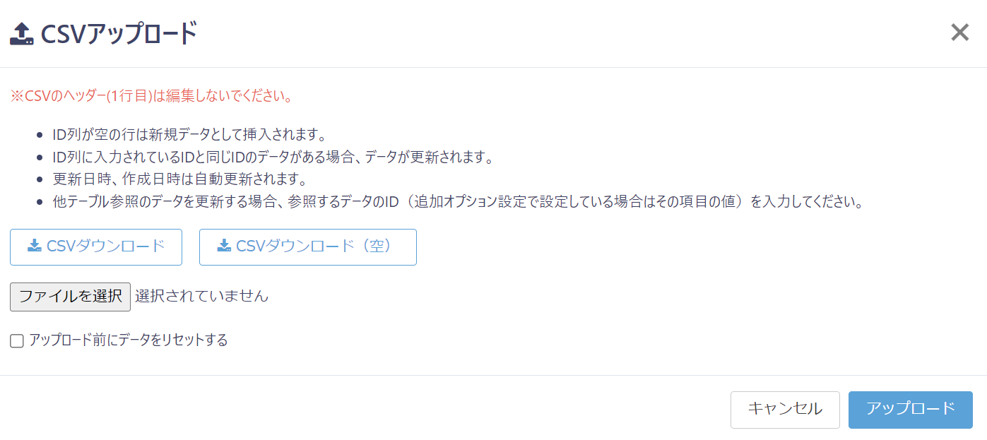 この機能にチェックを入れてCSVアップロードを行うと、アップロード前にテーブルのレコードデータが全削除された後、アップロードされたCSVのデータが作成されます。