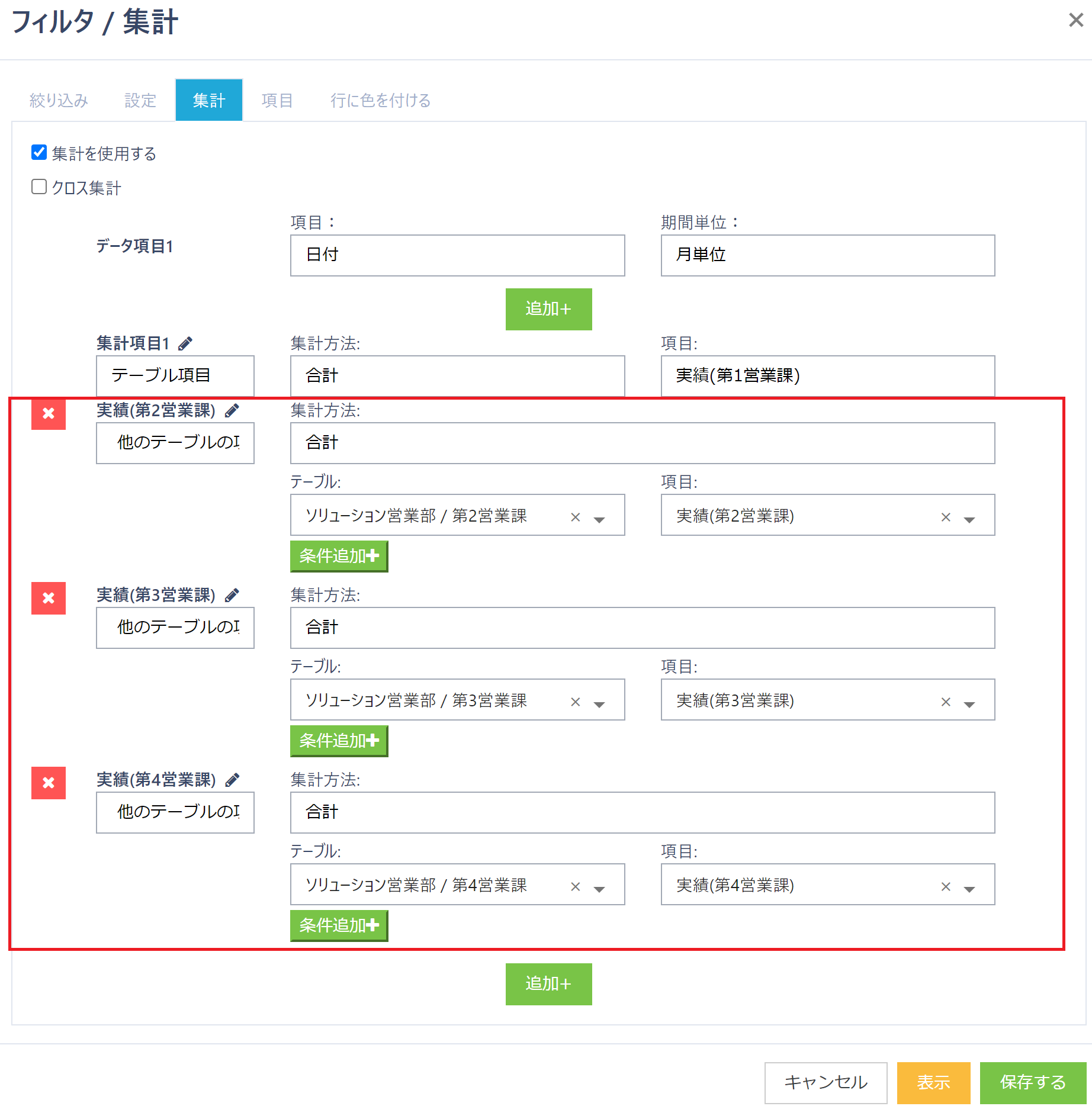 集計項目については、「他のテーブルの項目」を選択し、以下赤枠のように設定を行います。