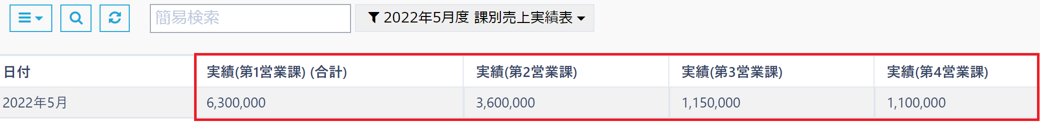 以下のように集計結果が表示され、それぞれの課の実績の比較ができます。