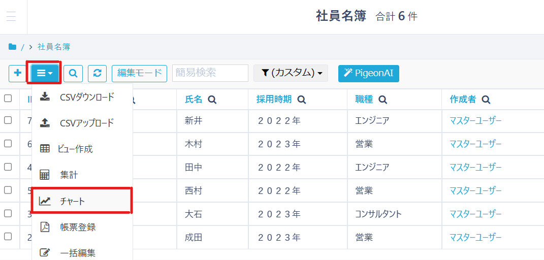 集計設定画面の「チャート」タブで、各集計項目の「グラフ」欄からグラフの種類を選択します。