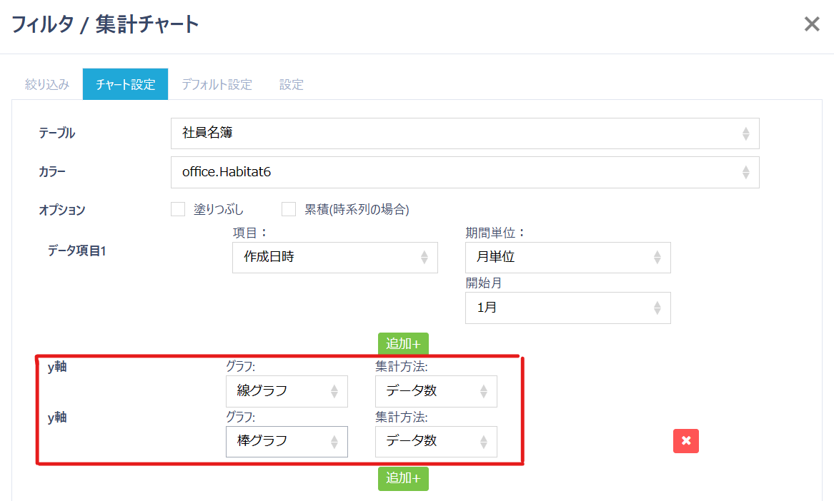 一方の集計項目に「棒グラフ」、もう一方に「線グラフ」を設定します。