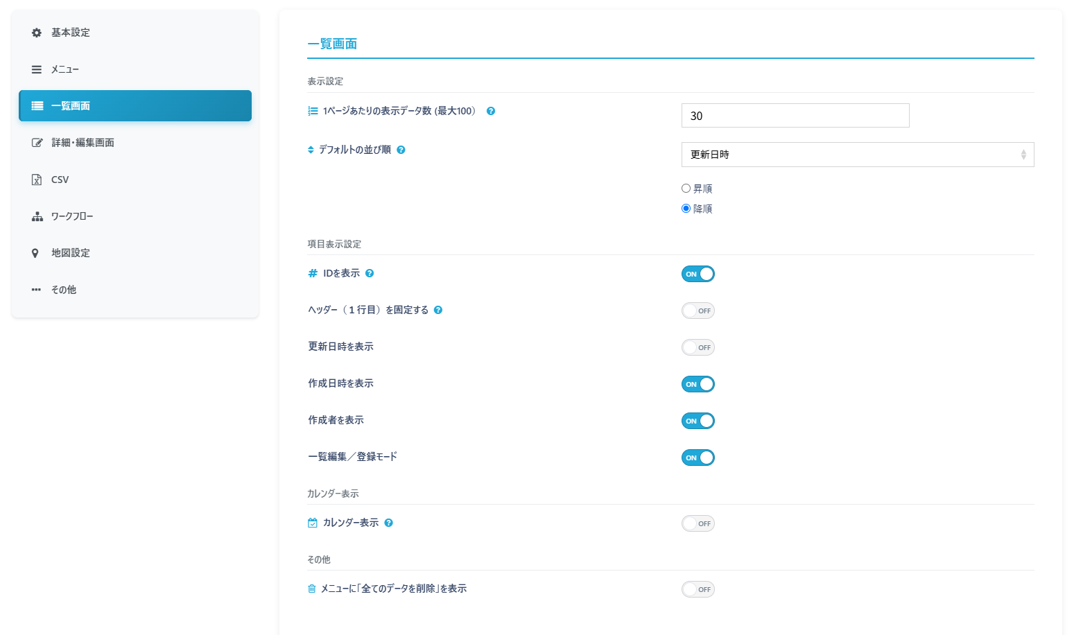 | IDを表示 | 有効にすると一覧画面/詳細画面でIDが表示されます。データを一意に識別する番号です。 |