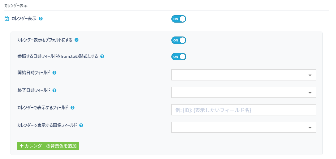 | カレンダー表示をデフォルトにする | 一覧画面でカレンダー表示をデフォルトにしたい場合有効にします。 |