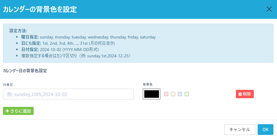 | カレンダーの背景色を追加 | 条件を指定して、カレンダーの背景色を設定することが出来ます。例えば、毎月25日は黄色、日曜日は赤色といった設定が複数登録可能です。 ・曜日指定: sunday, monday, tuesday, wednesday, thursday, friday, saturday ・日にち指定: 1st, 2nd, 3rd, 4th, ..., 31st (月の何日目か) ・日付指定: 2024-10-02 (YYYY-MM-DD形式) ・複数指定する場合はカンマ区切り(例: sunday,1st,2024-12-25) |