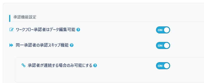 | 承認者が連続する場合のみ可能にする | 上記の「同一承認者の承認スキップ機能」が有効で、承認者が連続する場合のみ自動スキップにしたい場合に有効にします。 |