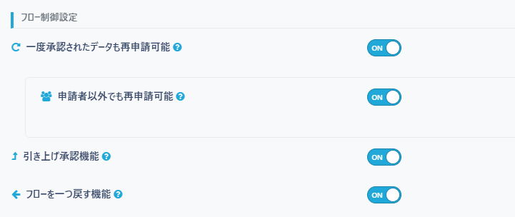 | 一度承認されたデータも再申請可能 | ワークフローを有効にすると設定可能です。有効にすると一度承認された申請のデータ変更があった場合、再申請が可能となります。 |