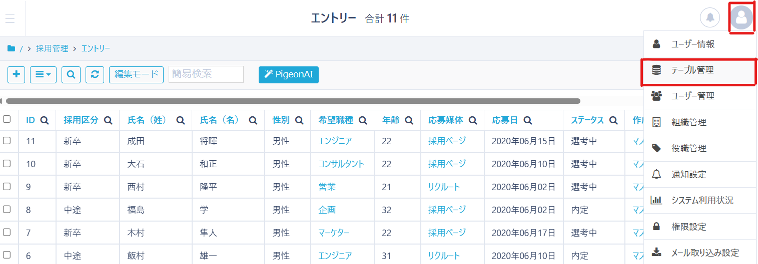 単一のテーブルを削除する場合、テーブル管理画面をクリックします。