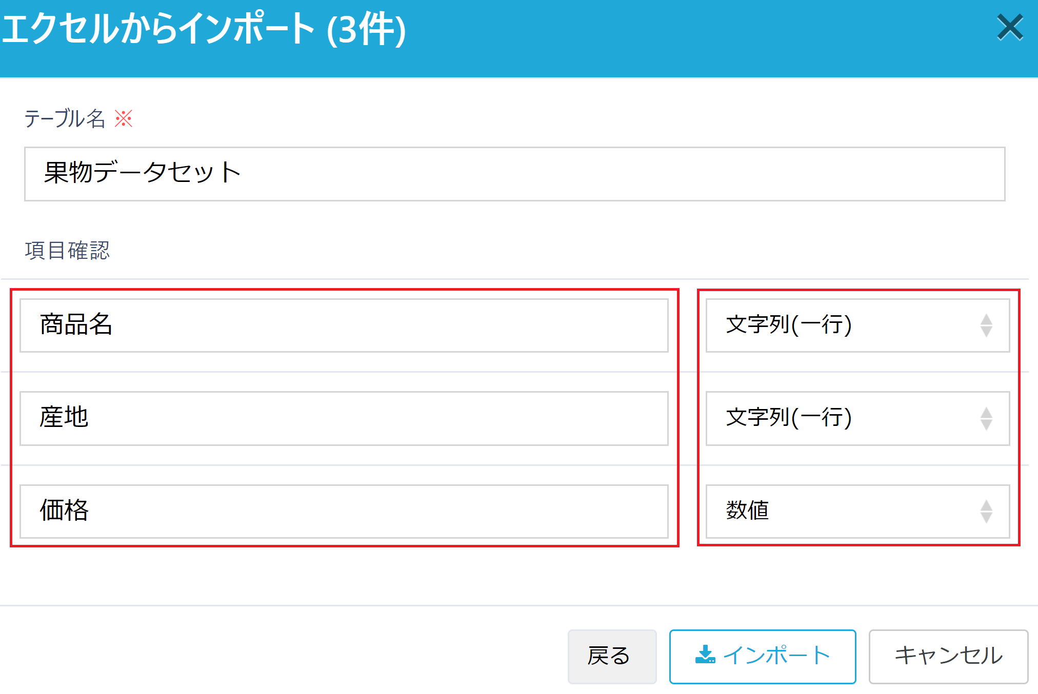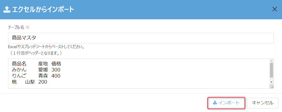 「インポート」を押下すると、テーブルが作成されます。