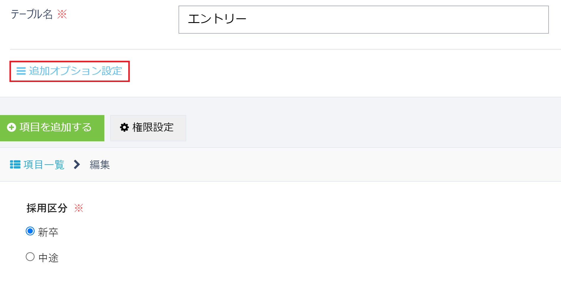 テーブルの編集画面より、「追加オプション設定」をクリックします。