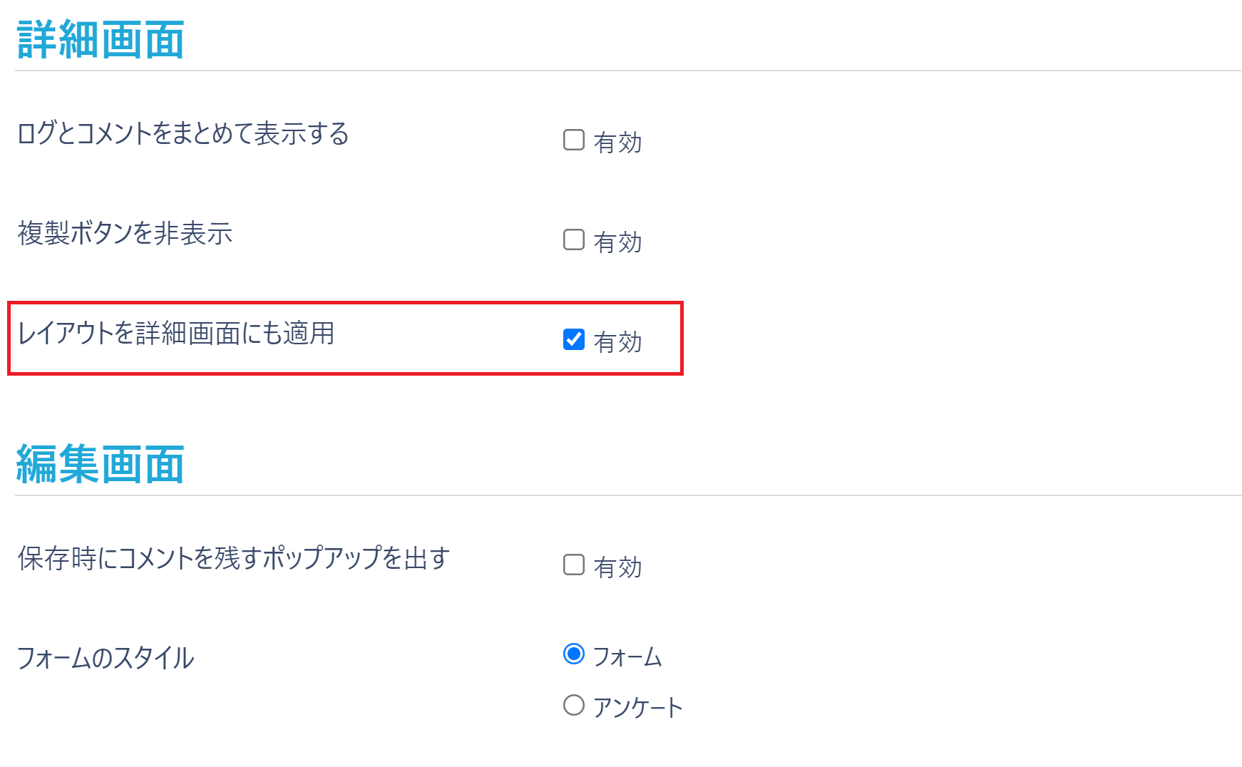 詳細画面の項目の「レイアウトを詳細画面にも適用」へチェックを入れ「更新」ボタンをクリックし設定を保存します。