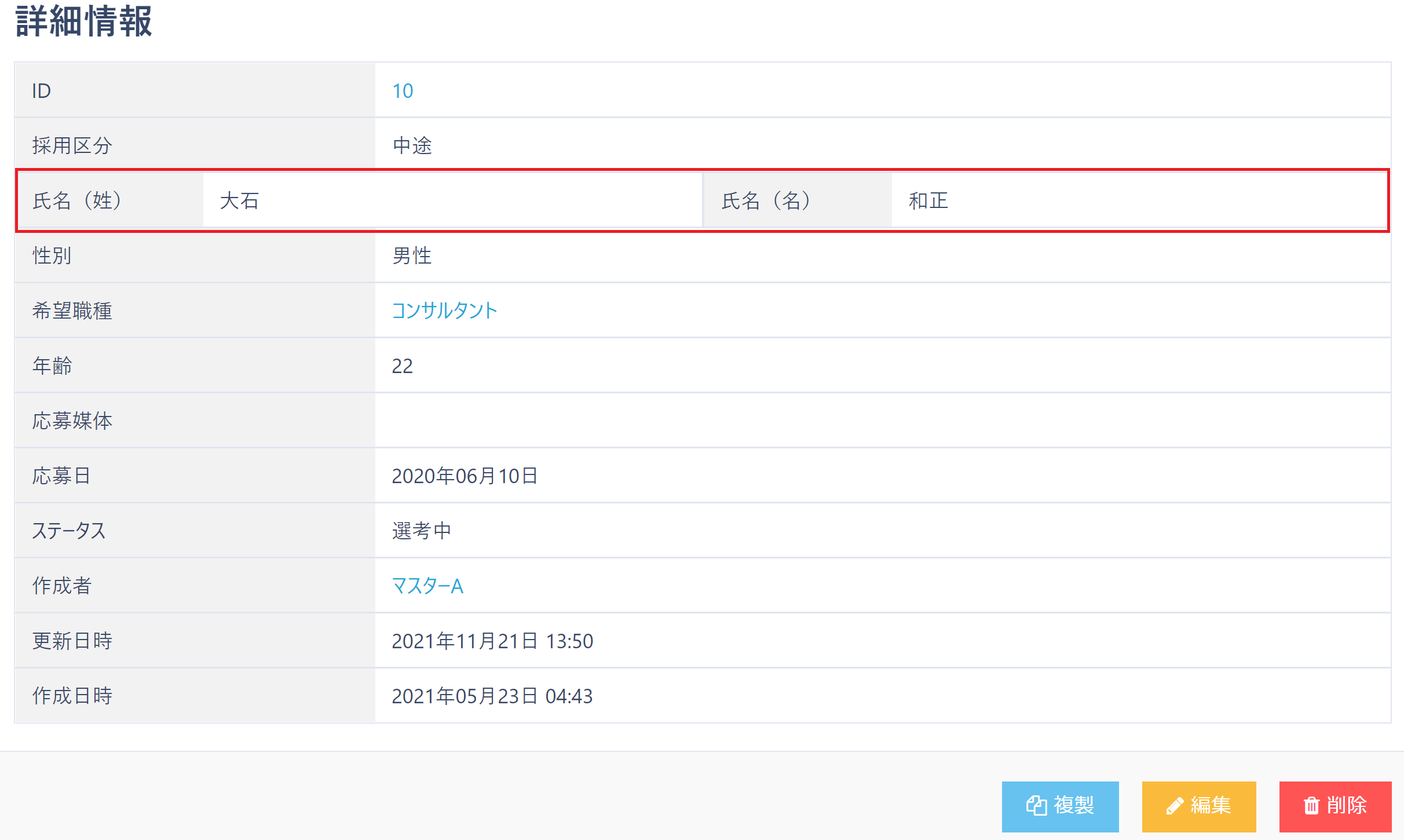 レコード詳細画面についても、追加フォームに合わせた表示が可能です。