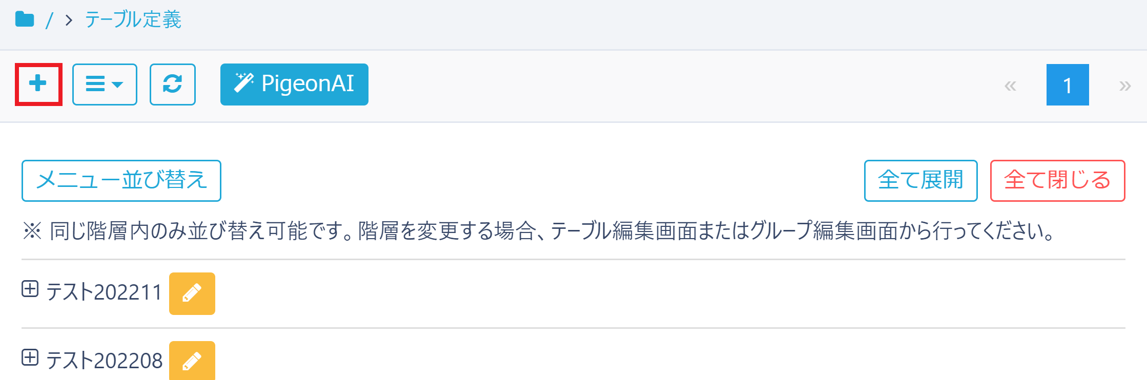 テーブル管理画面の左上に表示されている「+」マークをクリックし、テーブルの新規作成画面を開きます。