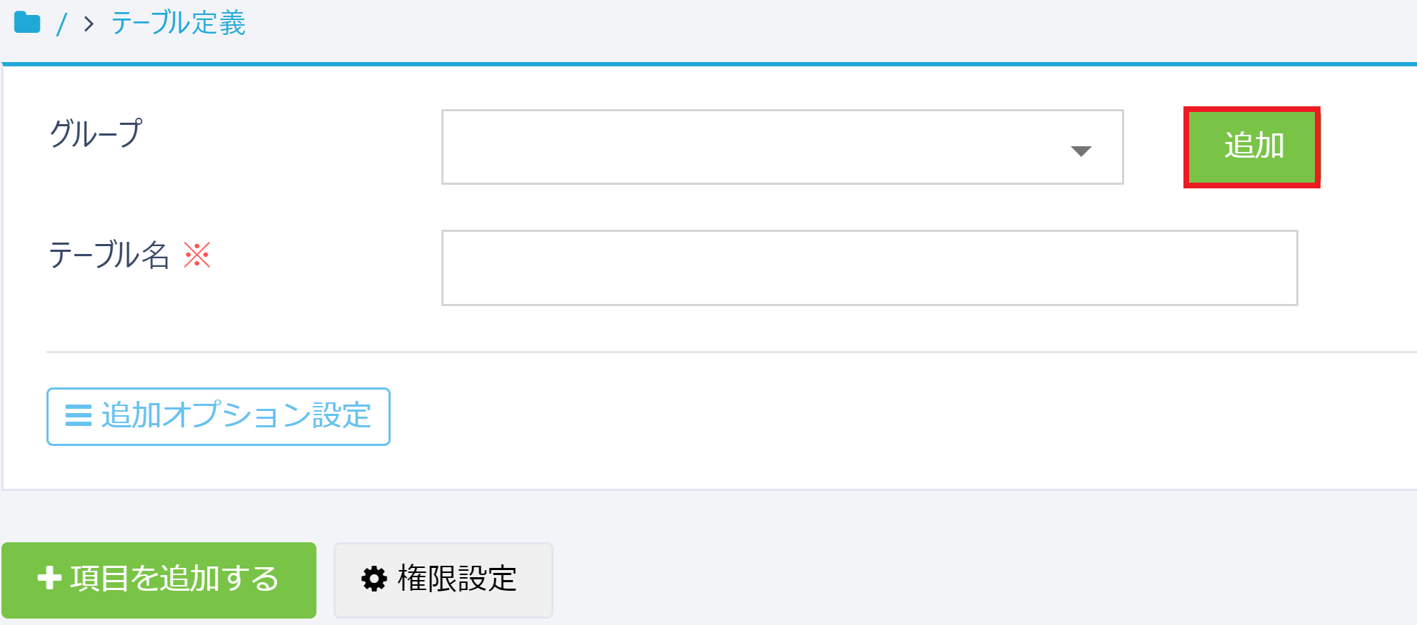 グループ内テーブル一括設定を行うため、【無し/全員編集可能】のいずれかを必要に応じて設定し、「追加」ボタンをクリックします。