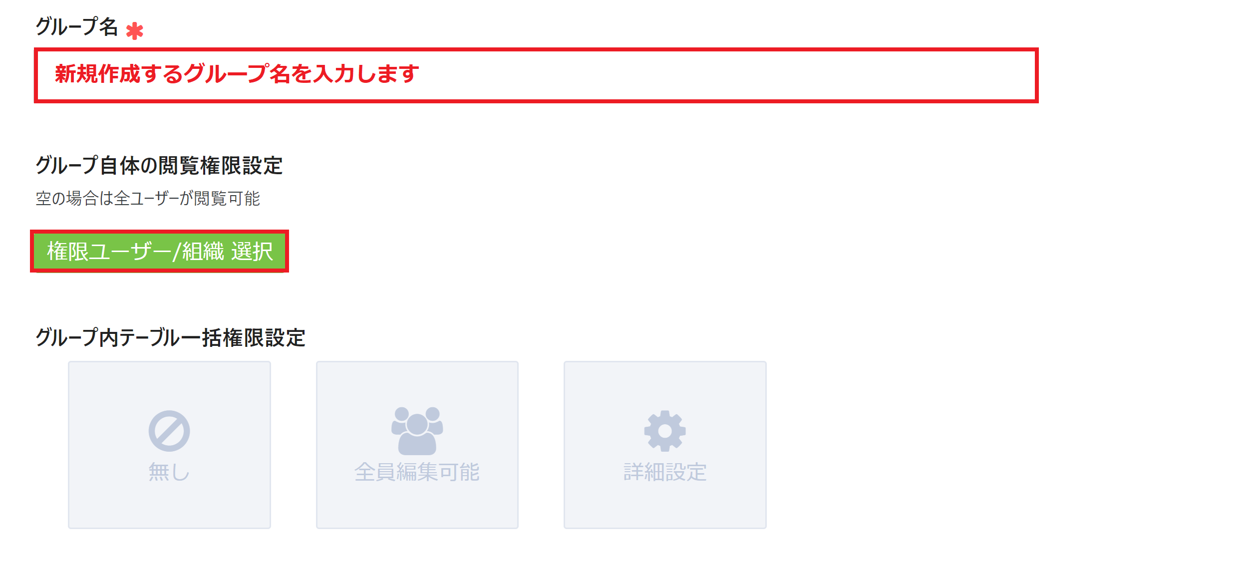 新規作成するグループ名を入力後、グループ自体の閲覧権限設定を行うため 「権限ユーザー/組織選択」ボタンをクリックします。