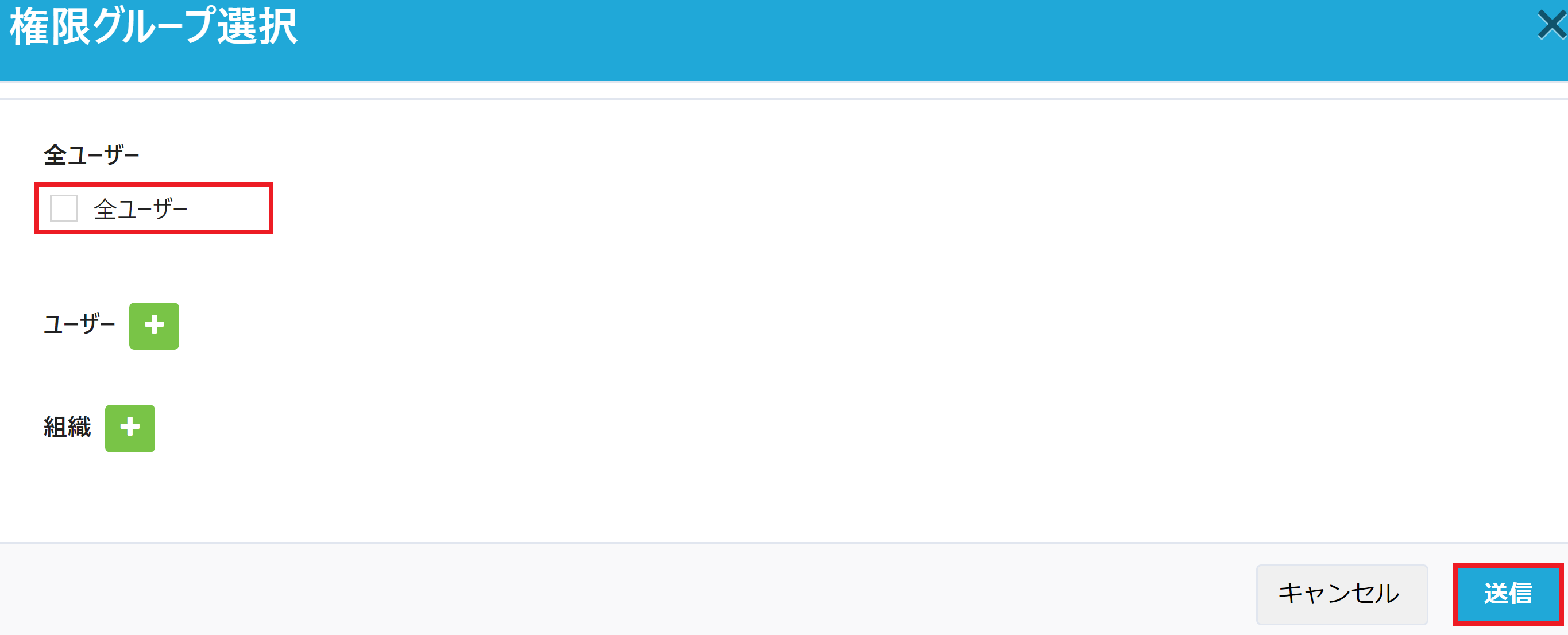 権限グループの設定を行います。【全ユーザー/ユーザー指定/組織指定】を必要に応じて設定し、「送信」ボタンをクリックします。