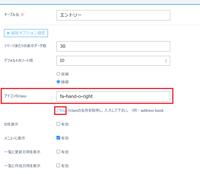 テーブル管理より、テーブル設定画面を開き「追加オプション設定」内「アイコンのclass」を設定することでアイコンの変更が可能です。