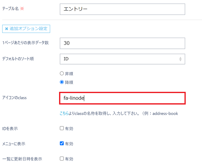 「アイコンのclass」の欄にコピーした「fa-linode」を貼り付けます。