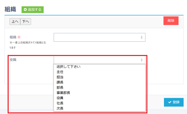 登録済みの役職名は、ユーザー登録時の「組織」設定の「役職」のプルダウンメニューへ反映されます。