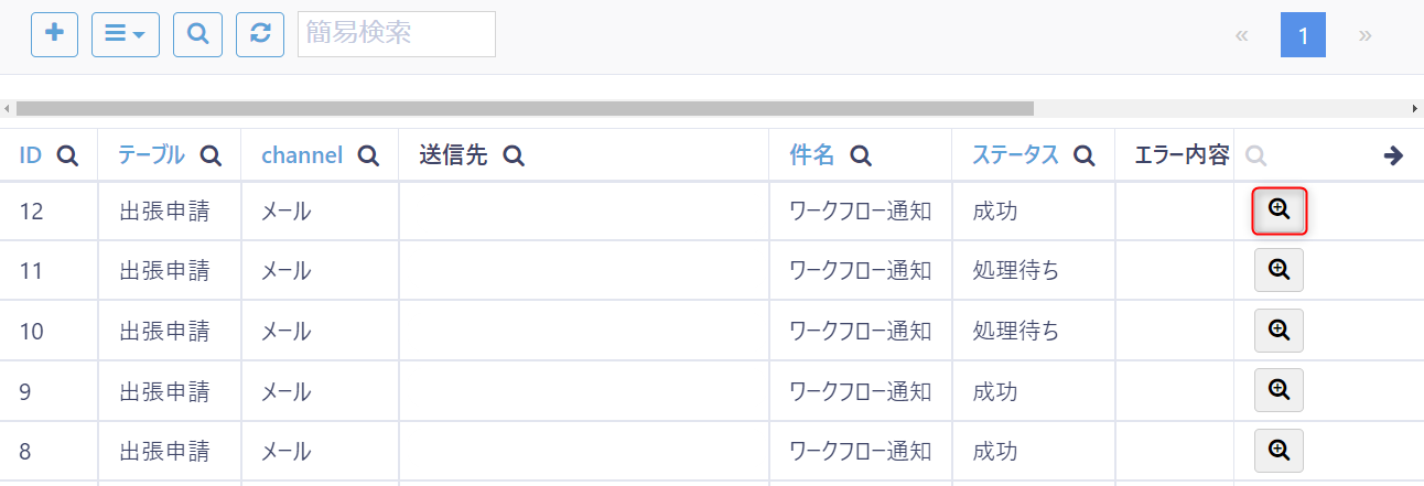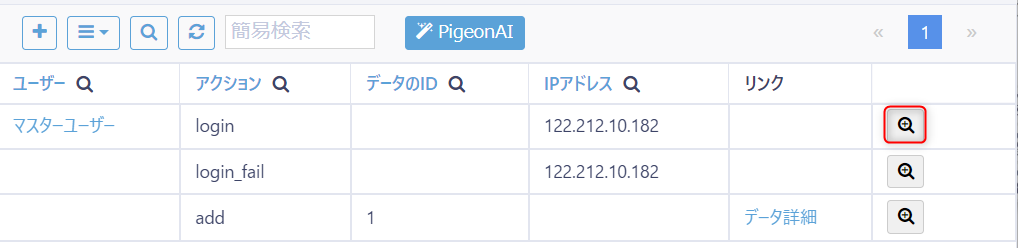 ログの詳細を確認する場合は、行の右に表示されている虫眼鏡マークをクリックします。