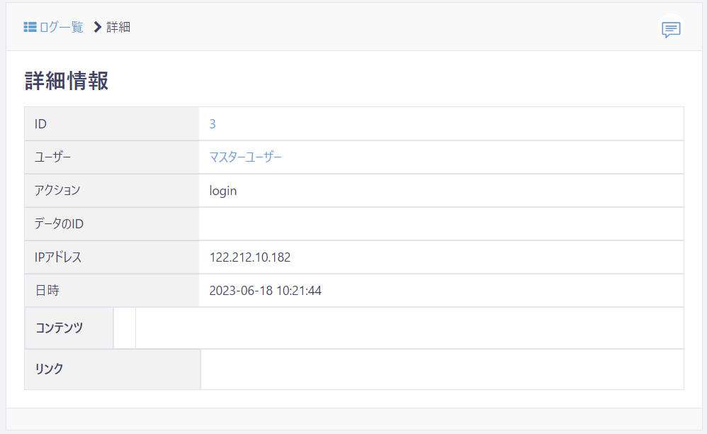 | ログ | ログイン・ログアウト、レコードの作成/編集のログを確認できます。 |