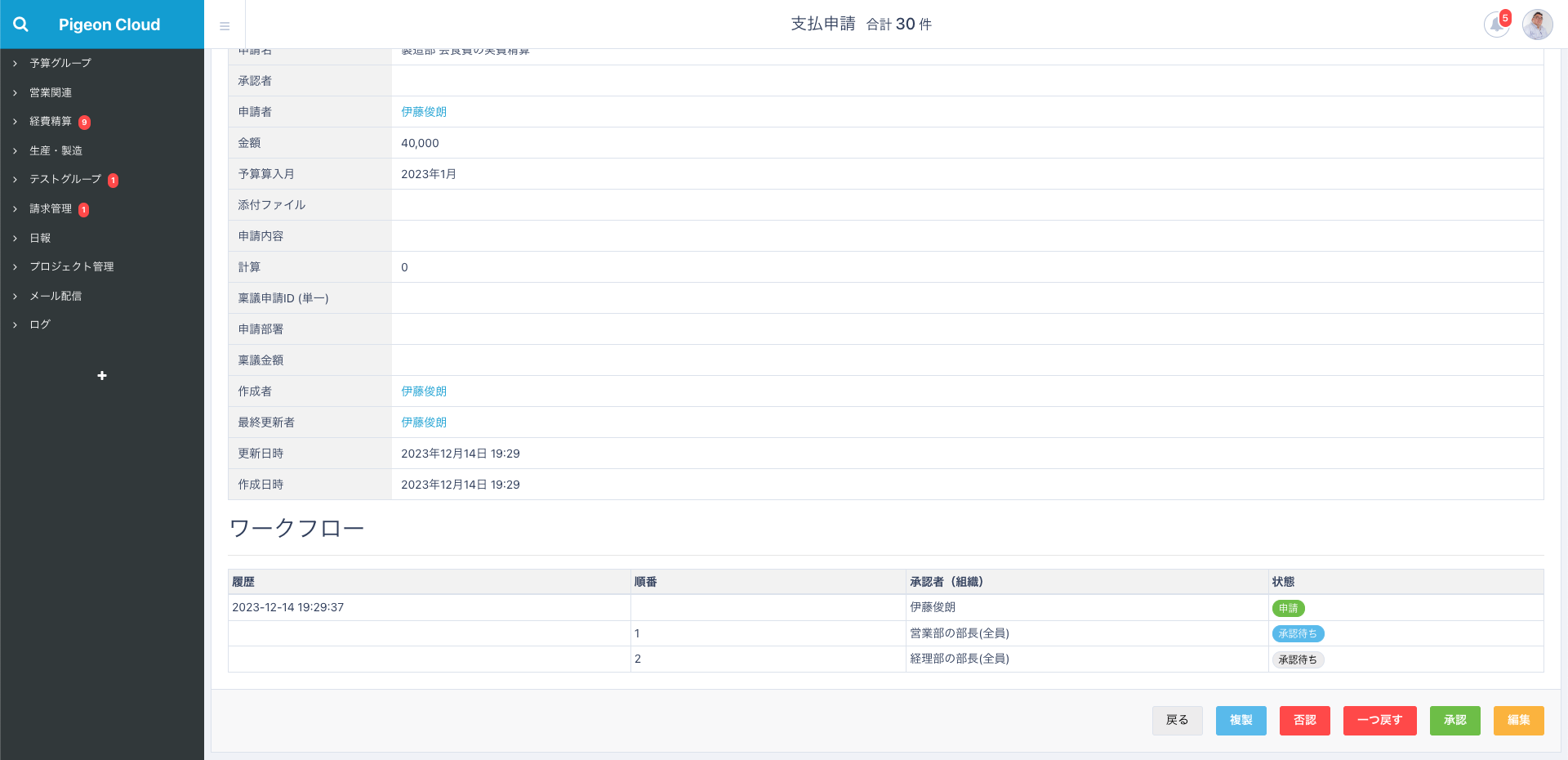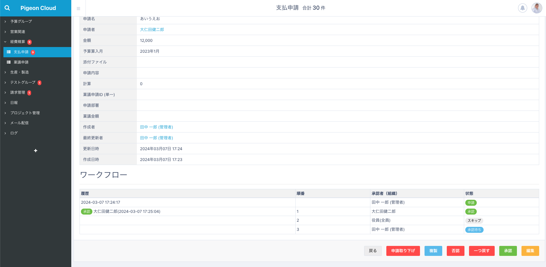 承認をする場合は「承認」ボタンをクリックし、差し戻す場合は「一つ戻す」或いは「否認」をクリックしてください。