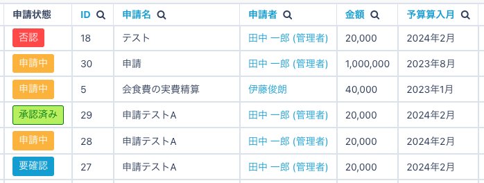 | 要確認 | ログイン中のユーザーに対して承認依頼が届いている状態を指します。承認依頼が届いているユーザー以外には「申請中」と表示されます。 |