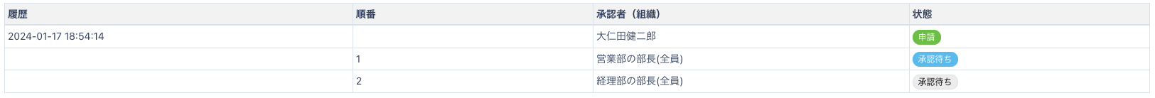 | 承認待ち (水色) | 該当の承認ステップに対して、承認依頼が回ってきている状態を指します。 |
