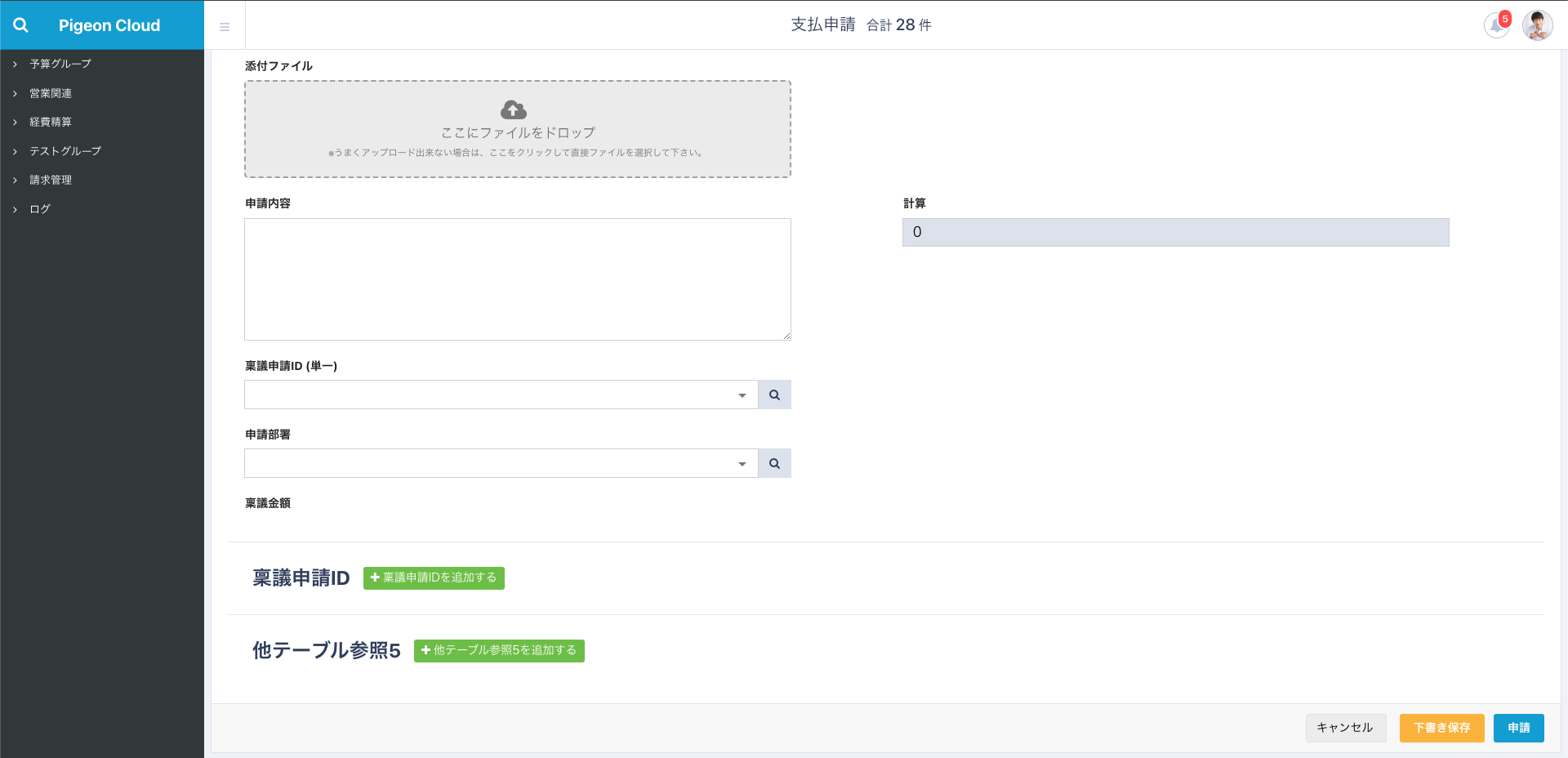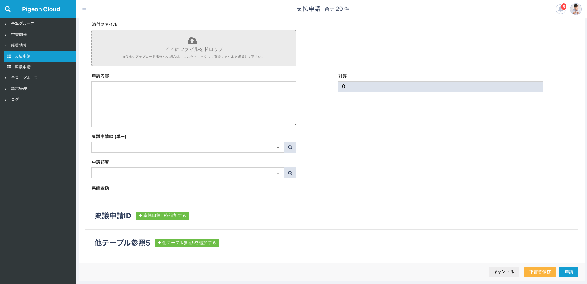 申請者はレコード作成に必要な全ての項目を入力後に、編集画面の右下にある「申請」という青いボタンをクリックしてください。