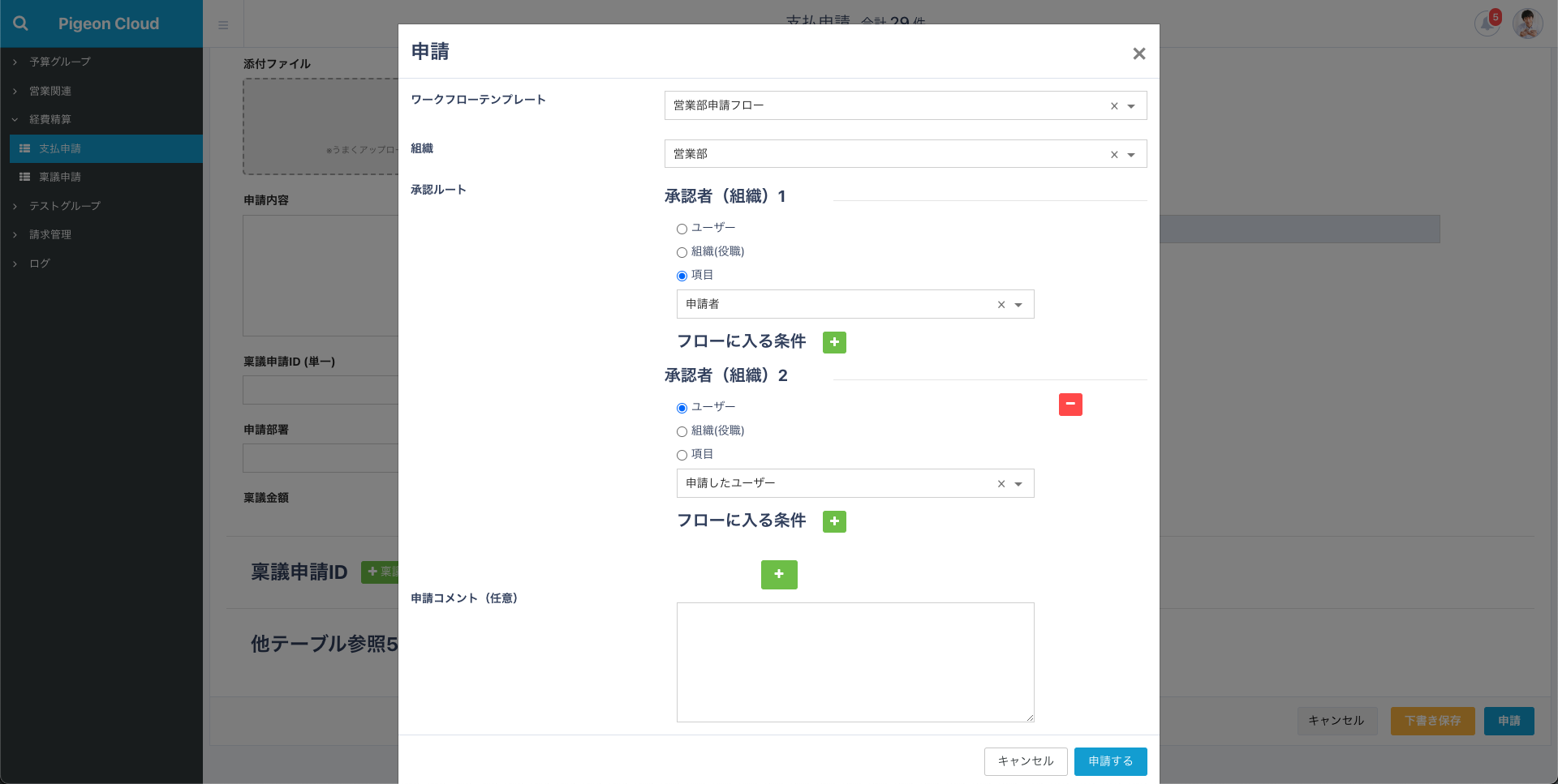 申請ワークフローを設定し、モーダルウィンドウ内の右下にある「申請する」という青いボタンをクリックしてください。