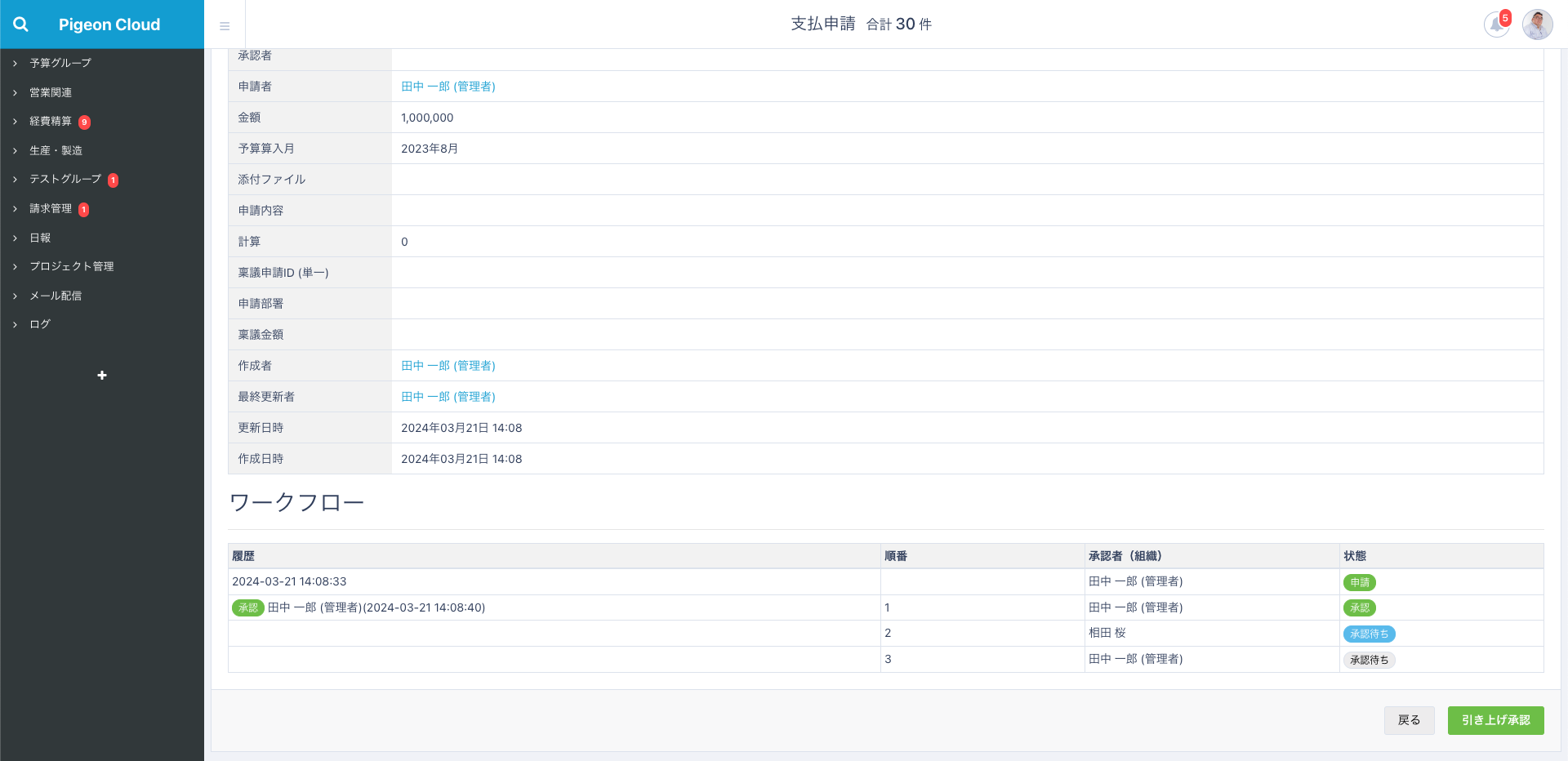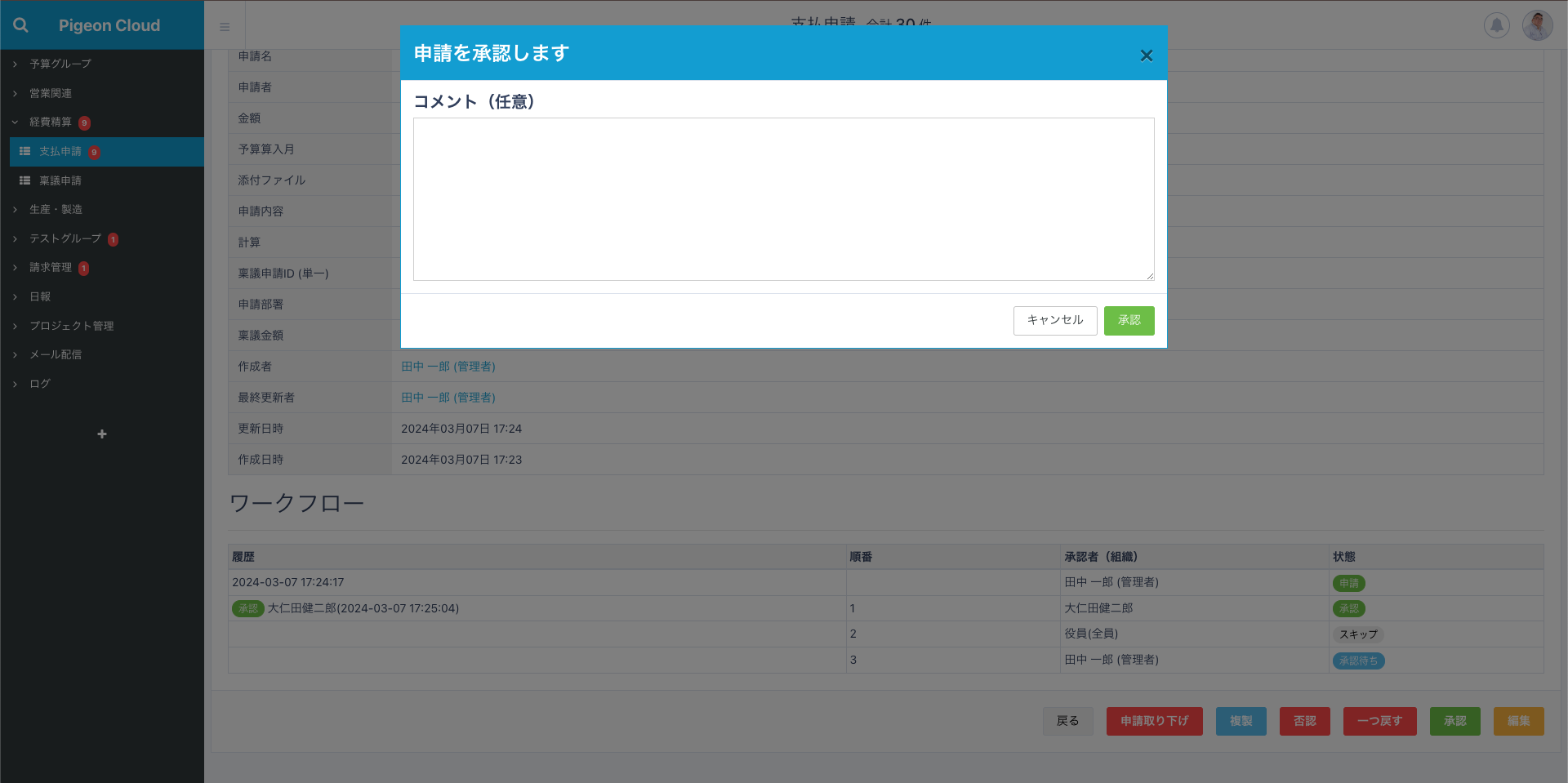 承認時や否認時にコメントを残しておく場合には、コメントを入力後にモーダルウィンドウ内の「承認」等のボタンをクリックしてください。