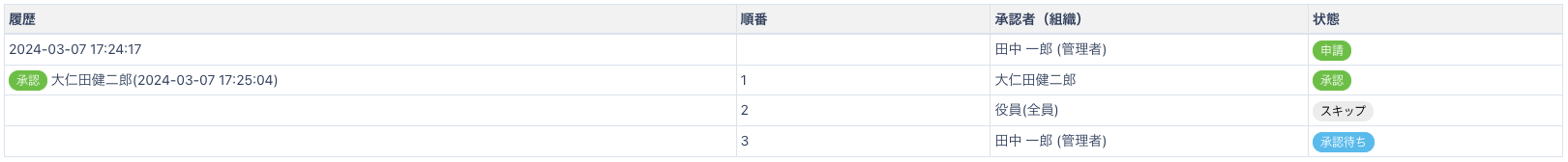 | スキップ | ワークフローに入る条件に合致していなかったため、該当の承認ステップがスキップされた状態を指します。 |