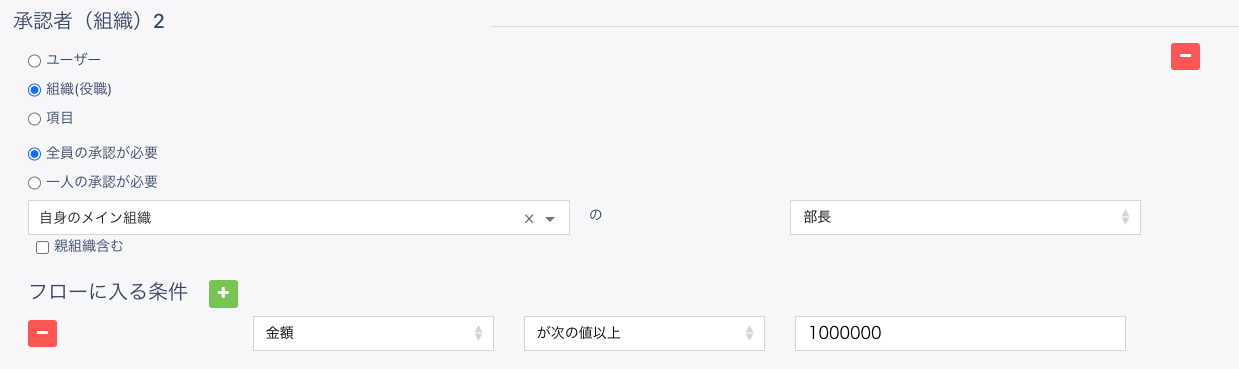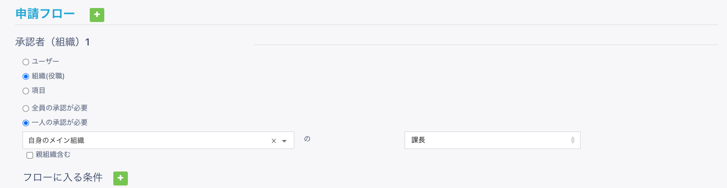 承認者1には [組織 (役職)] を選択し、条件で [一人の承認が必要] で組織および役職を [自身のメイン組織] の [課長] で設定してください。