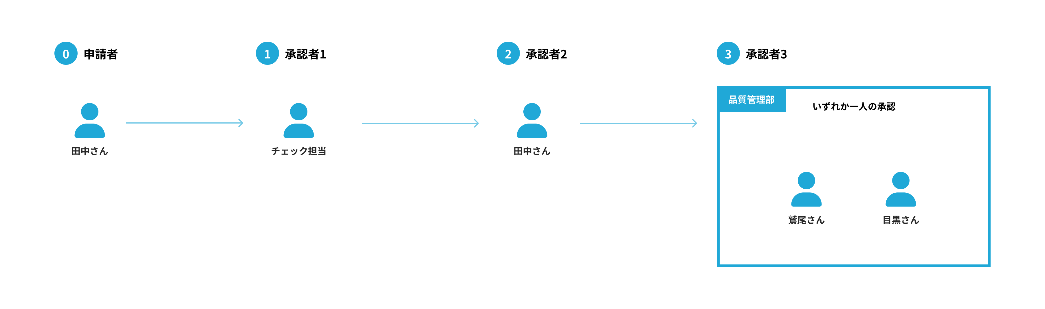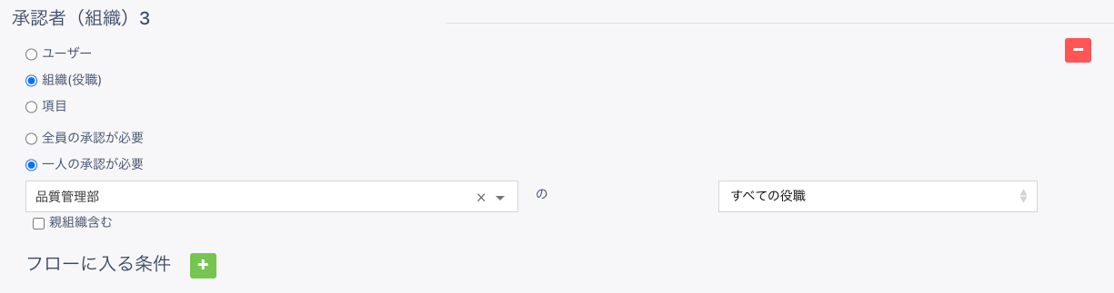 承認者3には [組織 (役職)] を選択し、条件で [一人の承認が必要] で組織および役職を [品質管理部] の [すべての役職] で設定してください。