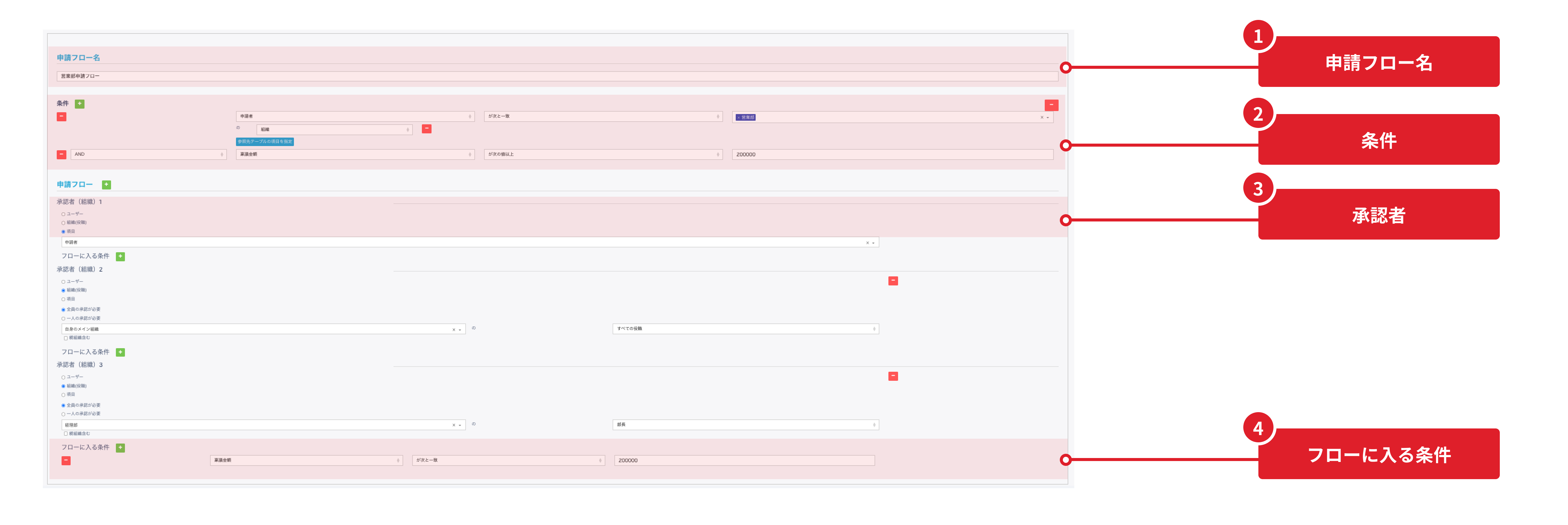 1. 申請フロー名 フロー名を事前に設定しておくことで、ユーザーが申請時のテンプレートを呼び出す際にわかりやすくなります。