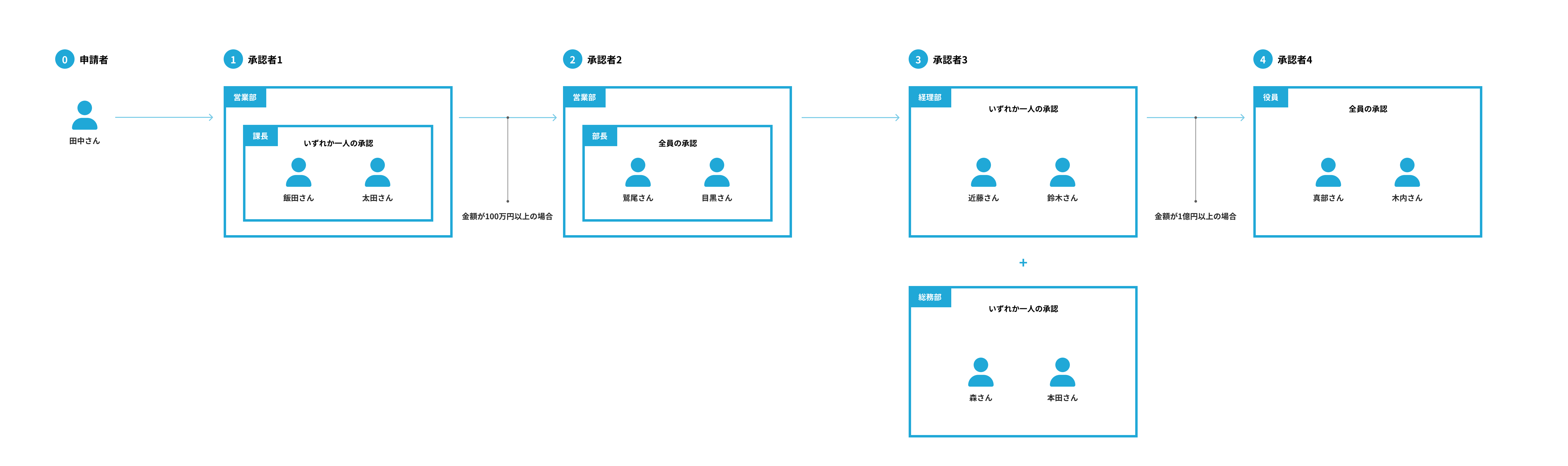 フローとしては、1. 営業部所属のいずれかの課長職の方に承認を取り、2. 続いて利用する予算の金額が100万円以上の場合に営業部所属の部長全員から承認を取り、3. 経理部所属のいずれかの方と総務部所属のいずれかの方がチェックをして、4. もし1億円以上の案件の場合は必ず役員承認を全員から取るとしたときで考えます。