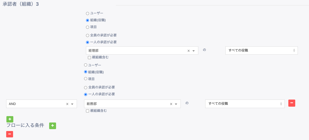 承認者3には [組織 (役職)] を選択し、条件で [一人の承認が必要] で組織および役職を [経理部] の [すべての役職] および ([AND]) 条件で [一人の承認が必要] で組織および役職を [総務部] の [すべての役職]で設定してください。