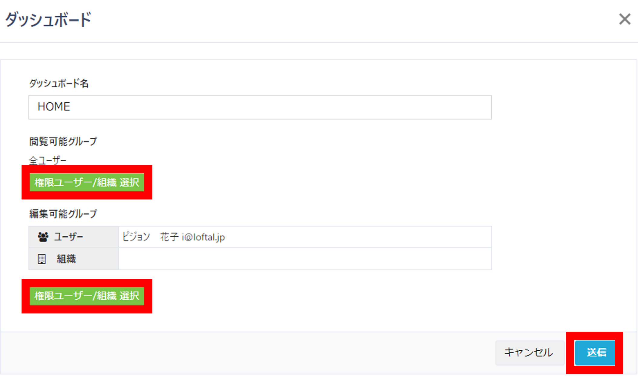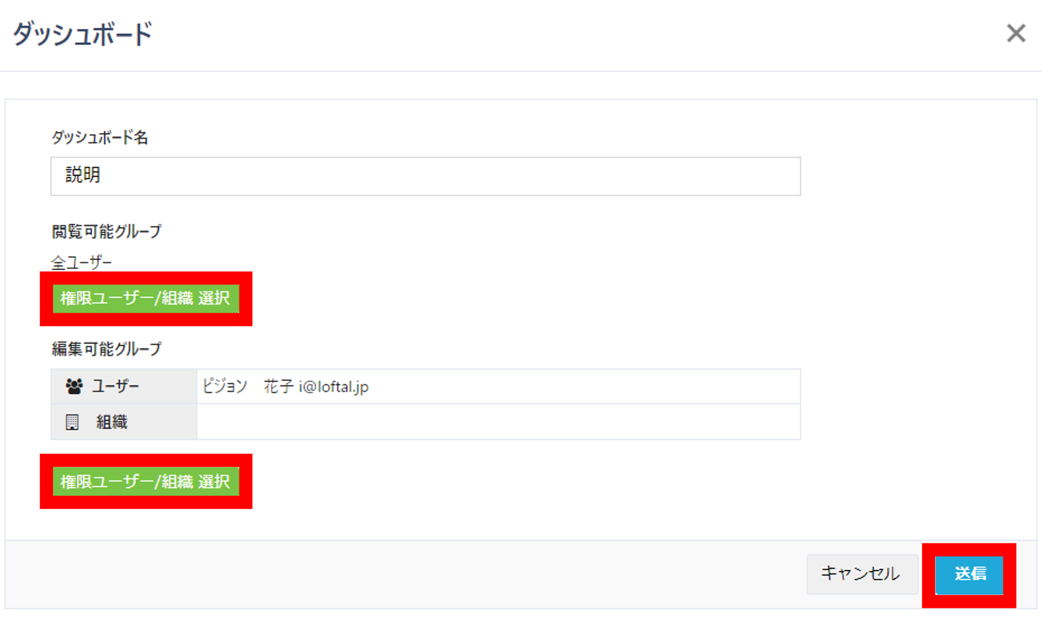 「ダッシュボード名」を入力し、閲覧権限及び編集権限を設定し、「送信」ボタンをクリックします。