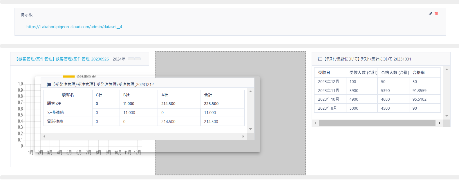 ダッシュボードには、掲示板やチャート追加したグラフ・テーブルの表示が可能です。