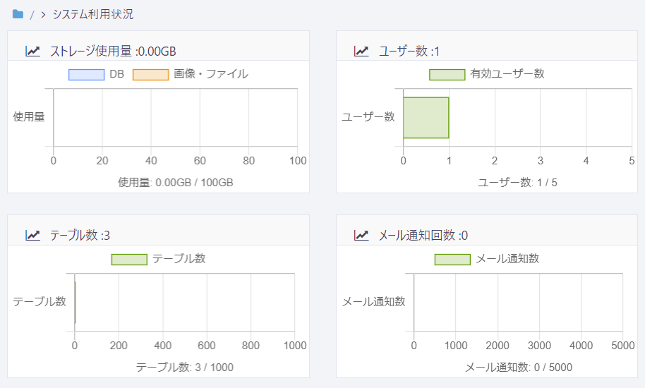 ストレージ使用量、ユーザー数、テーブル数、メール通知回数等がグラフで表示されます。