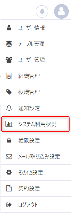 右上に表示されているアイコンをクリックし、メニューより「システム利用状況」を選択します。