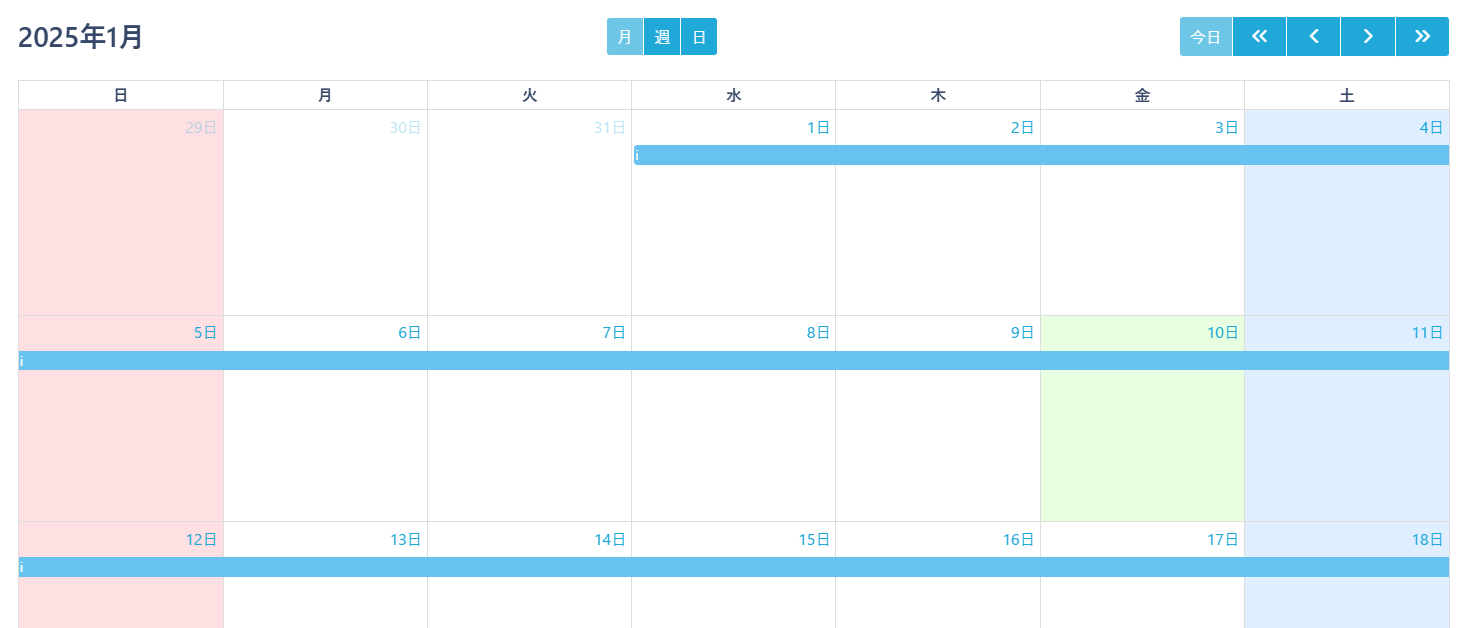以下アイコンをクリックすることにより表示ビューを「月」/「週」/「日」の形式へ切り替えることができます。