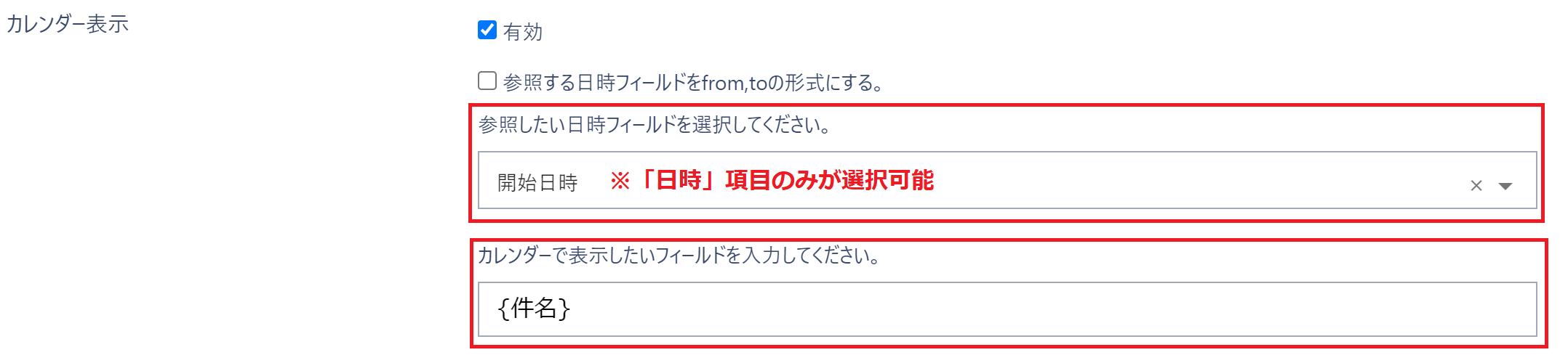 ・開始日時で参照したい日時フィールド」/「終了日時で参照したい日時フィールド」は「日時」項目のみが選択の対象となります。