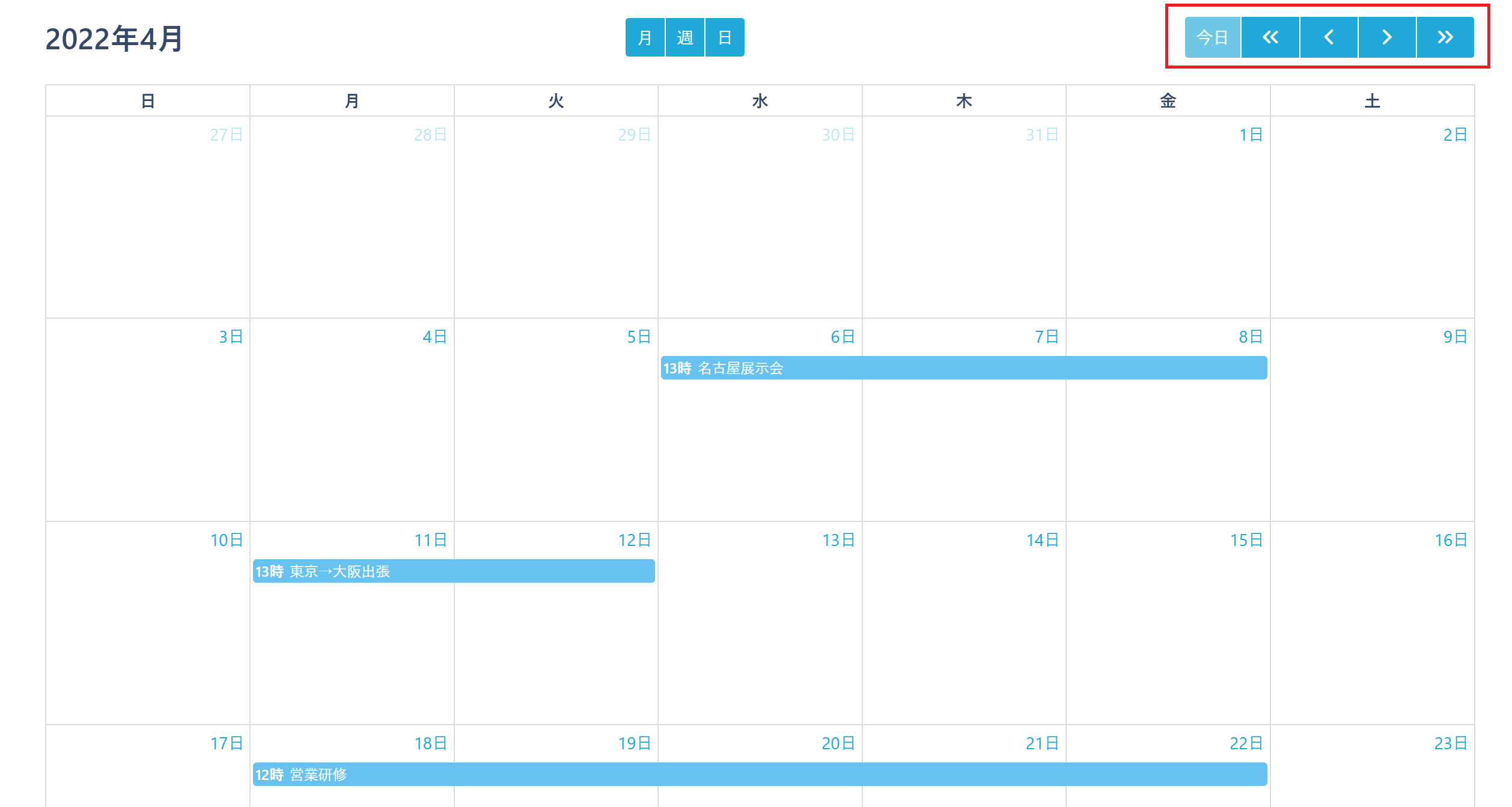 - 「>」:「翌日」or「翌週」or「翌月」の表示へ切り替える ※選択している表示ビューによって変わる