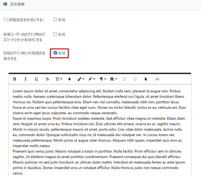「初回ログイン時に利用規約を表示する」の欄に表示されている「有効」チェックボックスにチェックを入れます。